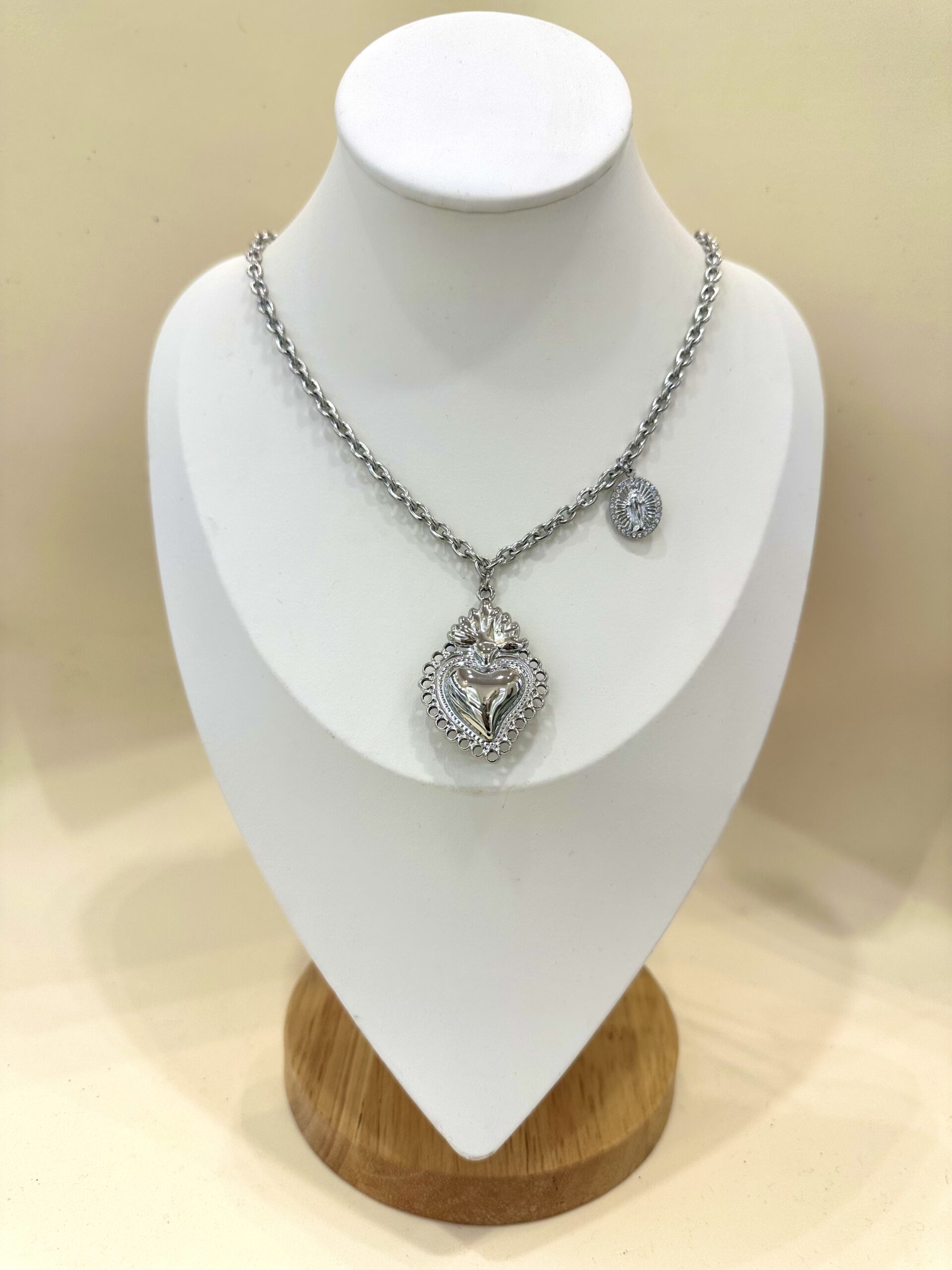Catena in acciaio inox con cuore sacro e piccola medaglietta sacra. Nickel free