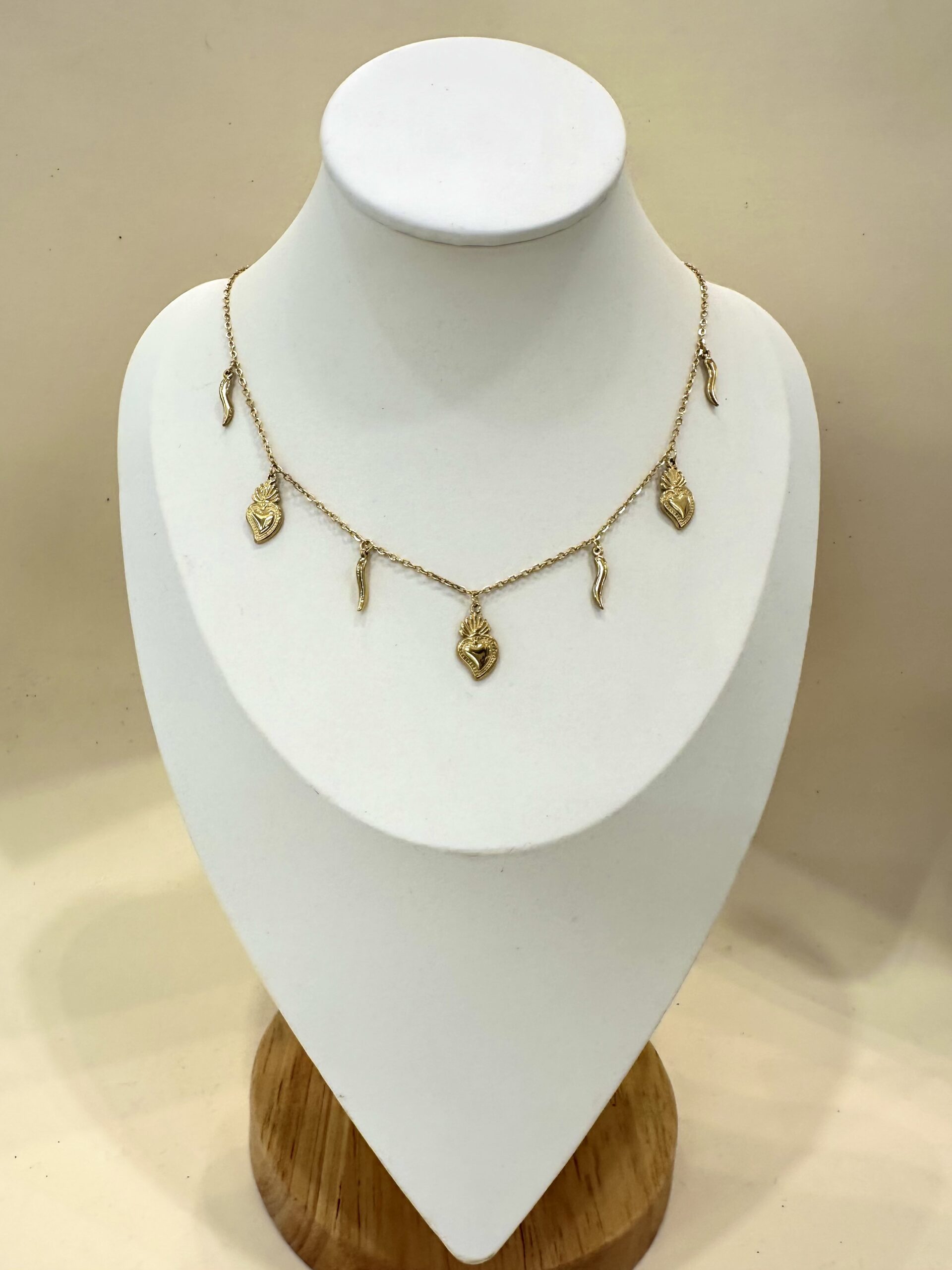 Catenina in acciaio placcato oro con piccoli charms raffiguranti cuori sacri e simboli portafortuna.Nichel Free
