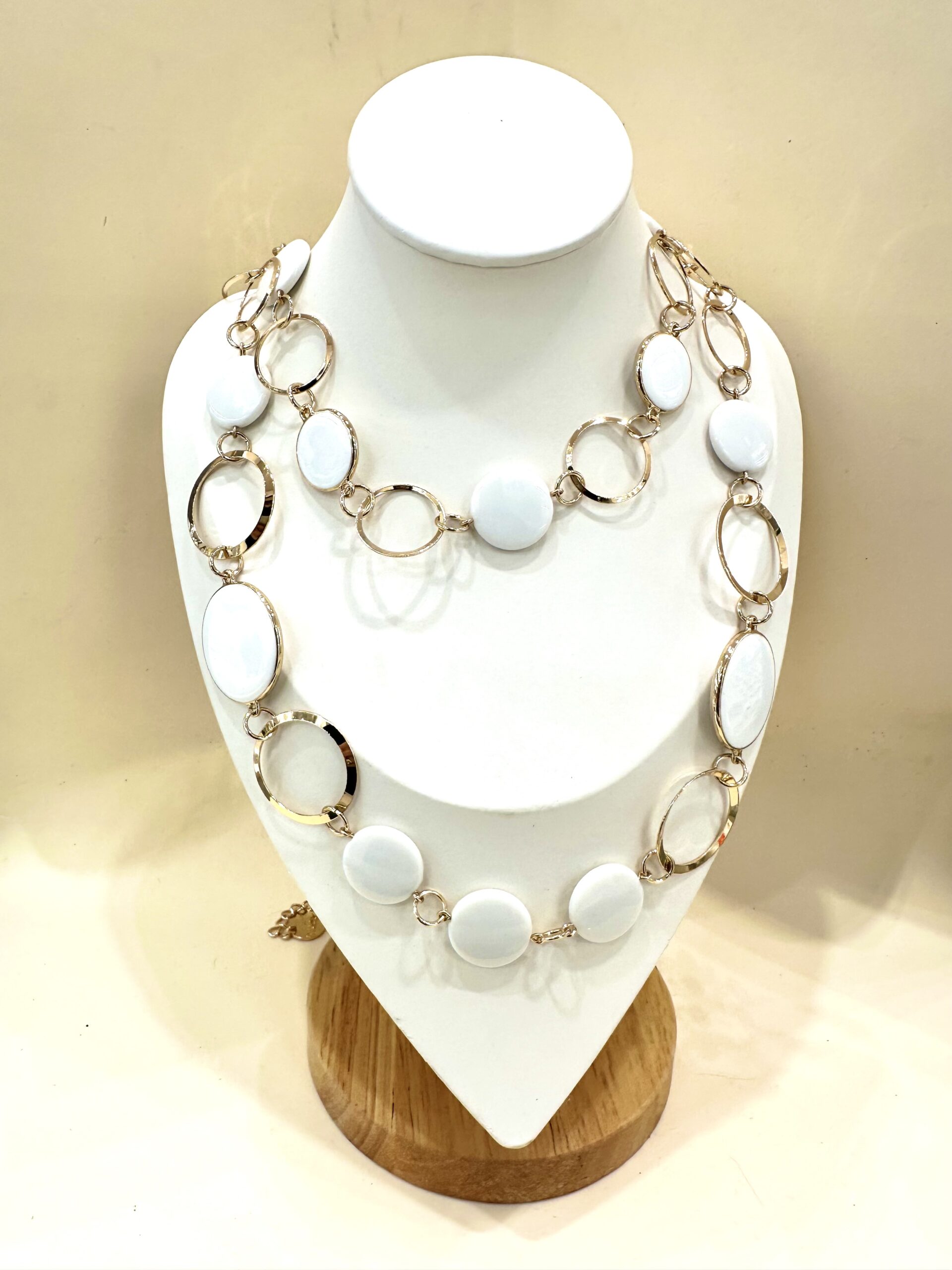 Collana lunga con anelli dorati e bottoni smalto bianco