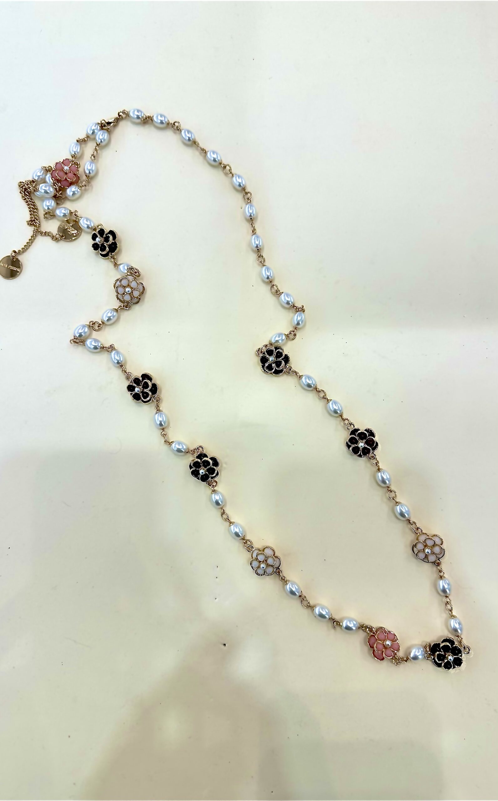 Collana lunga con perle e dettagli floreali e oro.
